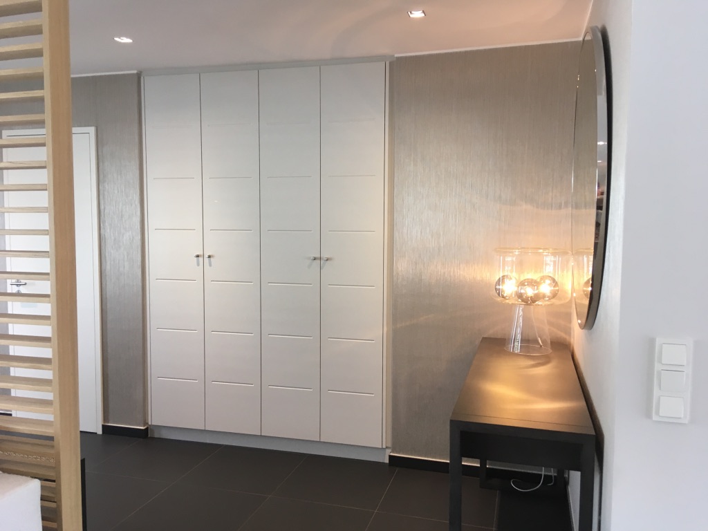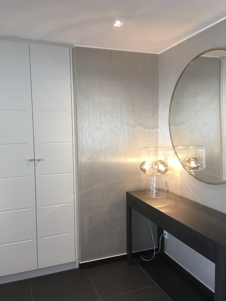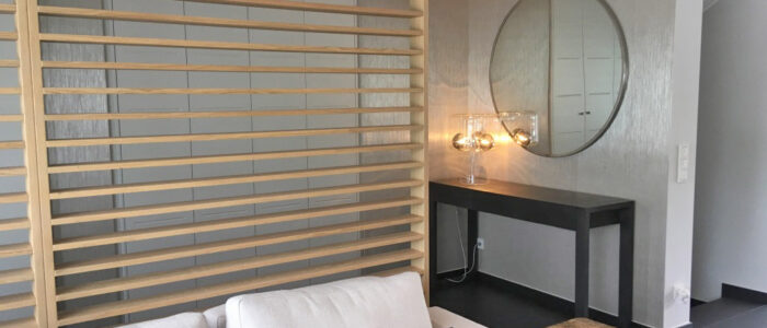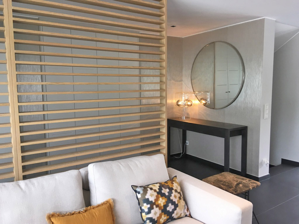L'entrée ouverte dont les murs ont été tapissés avec un revêtement semi brillant de chez Élitis a été cloisonnée partiellement avec un claustra en bois doux pour partager les espaces. Pour parfaire l'ensemble, une armoire encastrée sur mesure a été dessinée et réalisée par le menuisier.