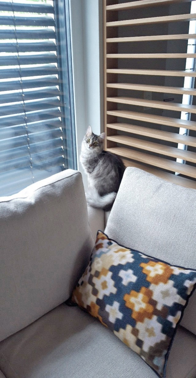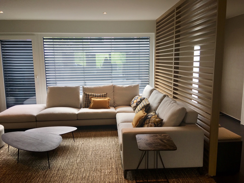 Avec les clients nous avons choisi les tissus des assises et les matériaux ensemble. Les murs ont été repeints avec la peinture Farrow & Ball.