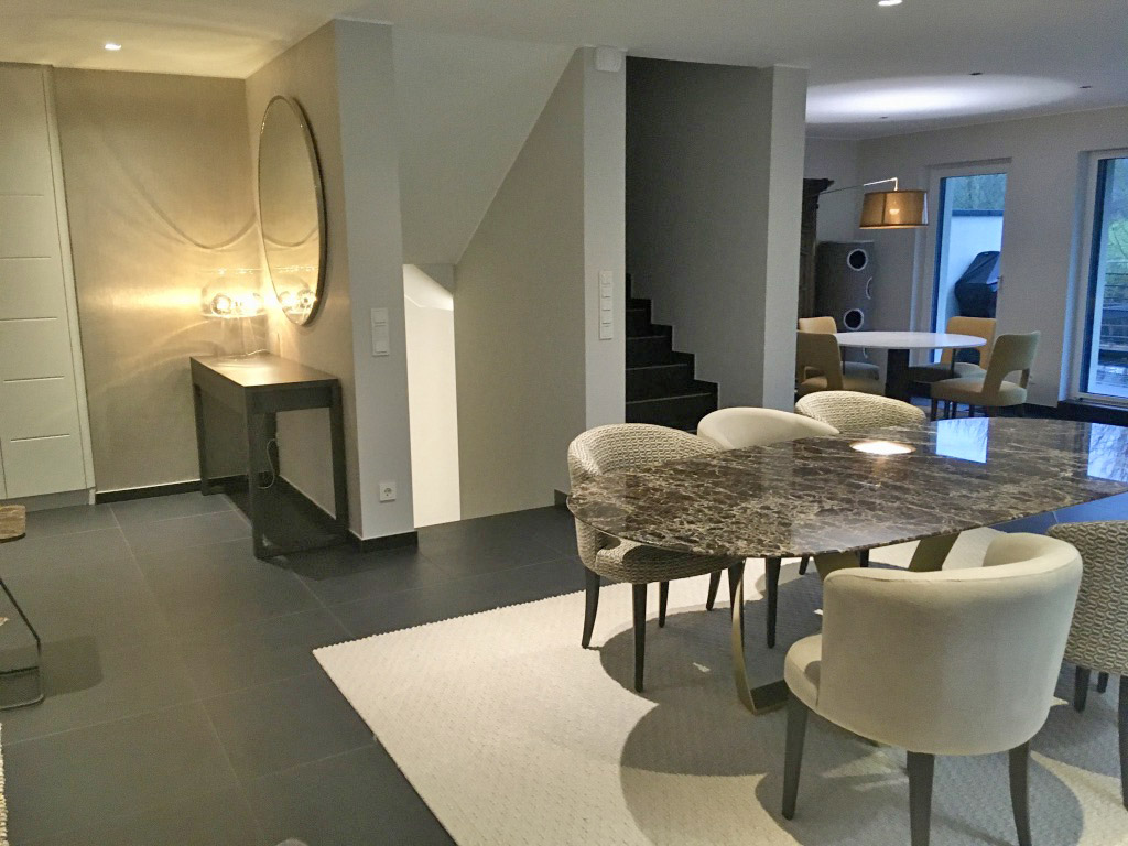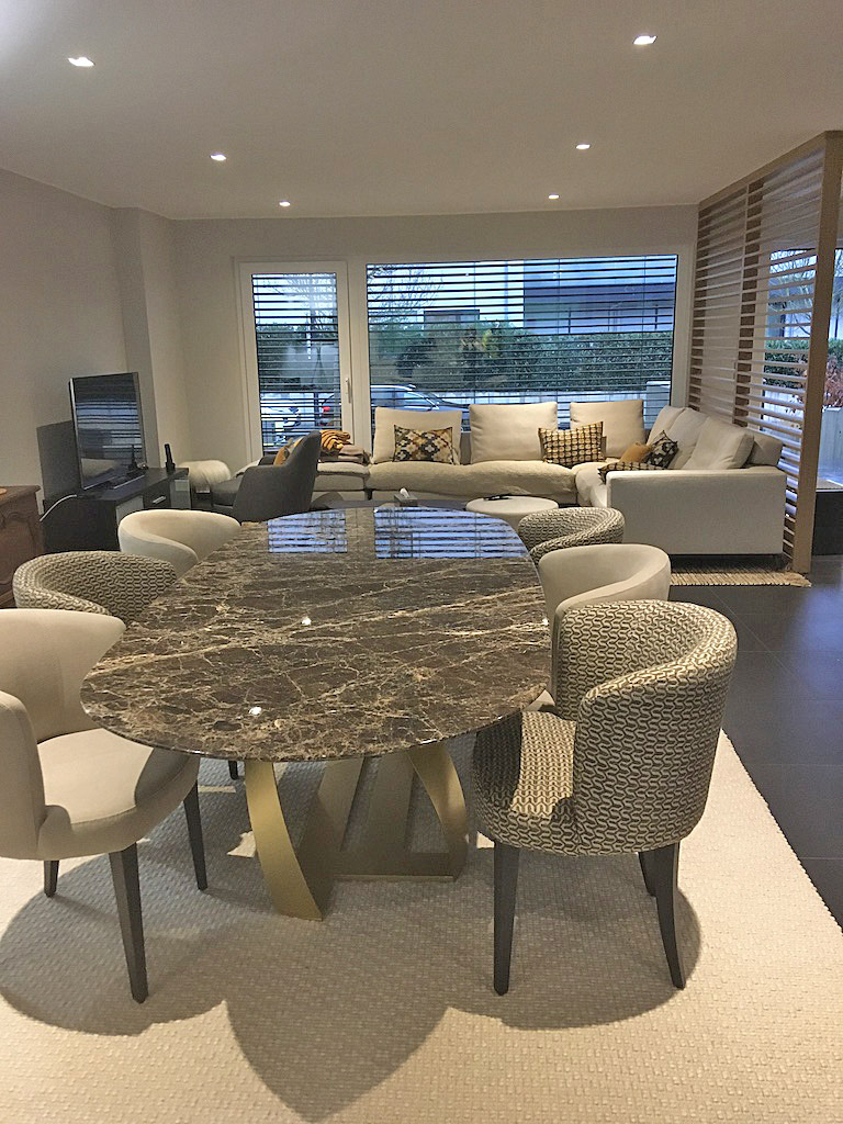 Une table de 2m50 en marbre Dark Emperador de chez Potocco trône au centre de l'espace.